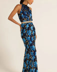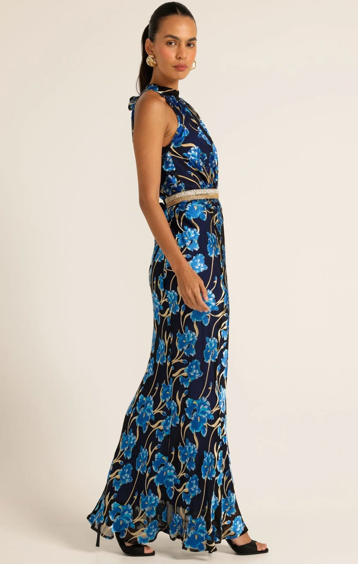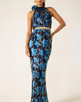 • Silk Rayon fabrication • Print is exclusive to SACHA DRAKE • Bias cut for fit ease • Comes with detached belt with sequin detailing • Maxi length • High halter neck • Fabric flower is removeable • Lined through the body • Elasticated waist • Slight mermaid hemline • Perfect for evening events and weddings • Designed in Australia