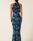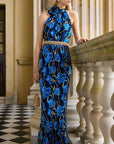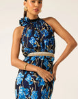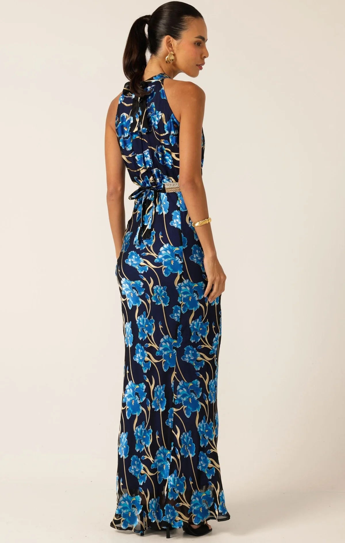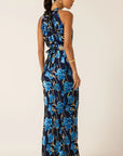 The Elea Halter Bias Dress is made from a luxurious silk rayon blend in an exclusive SACHA DRAKE print, cut on the bias for a flattering fit. With its elegant halter neck, removable fabric flower, and sequin-detailed belt, this maxi-length style is perfect for weddings and evening events.