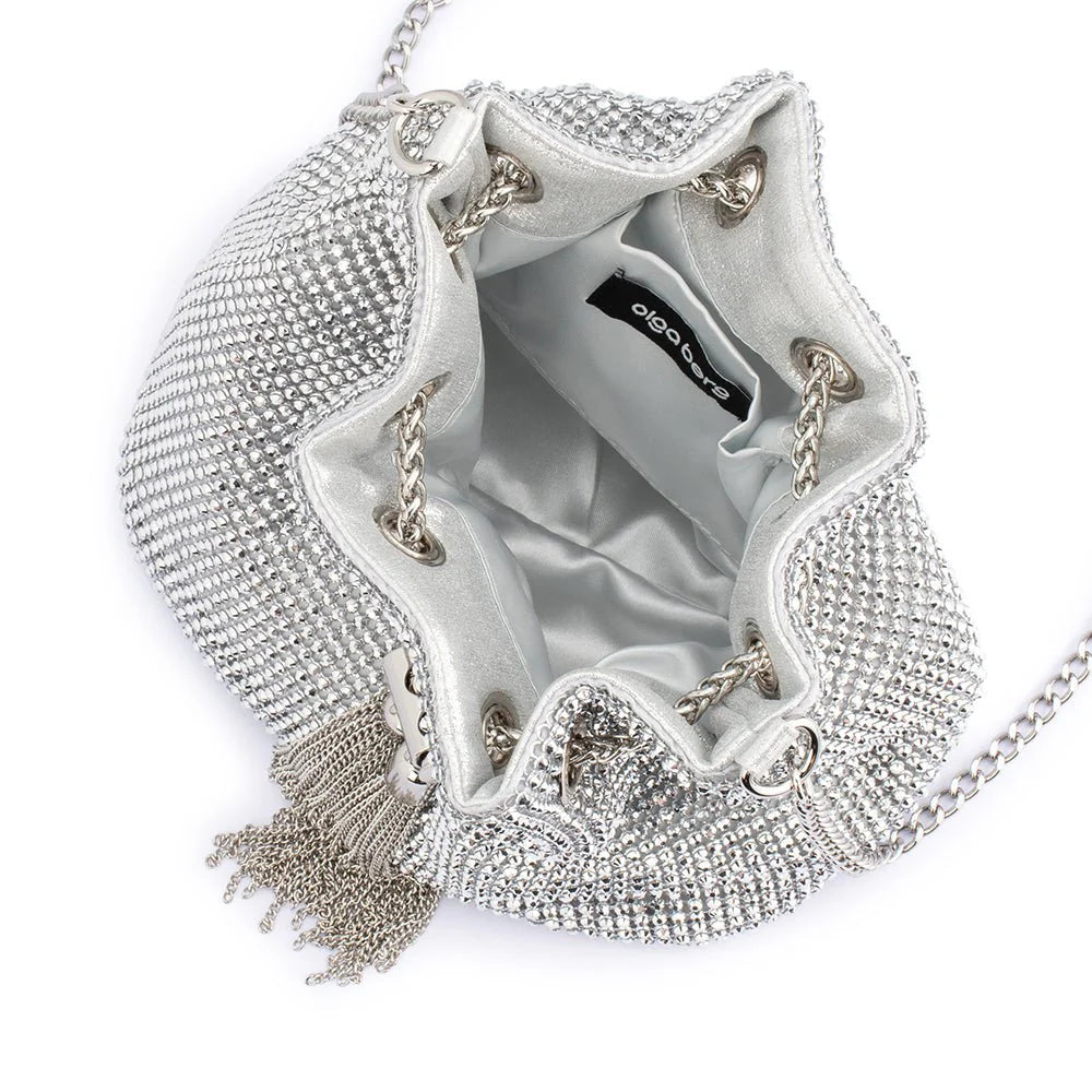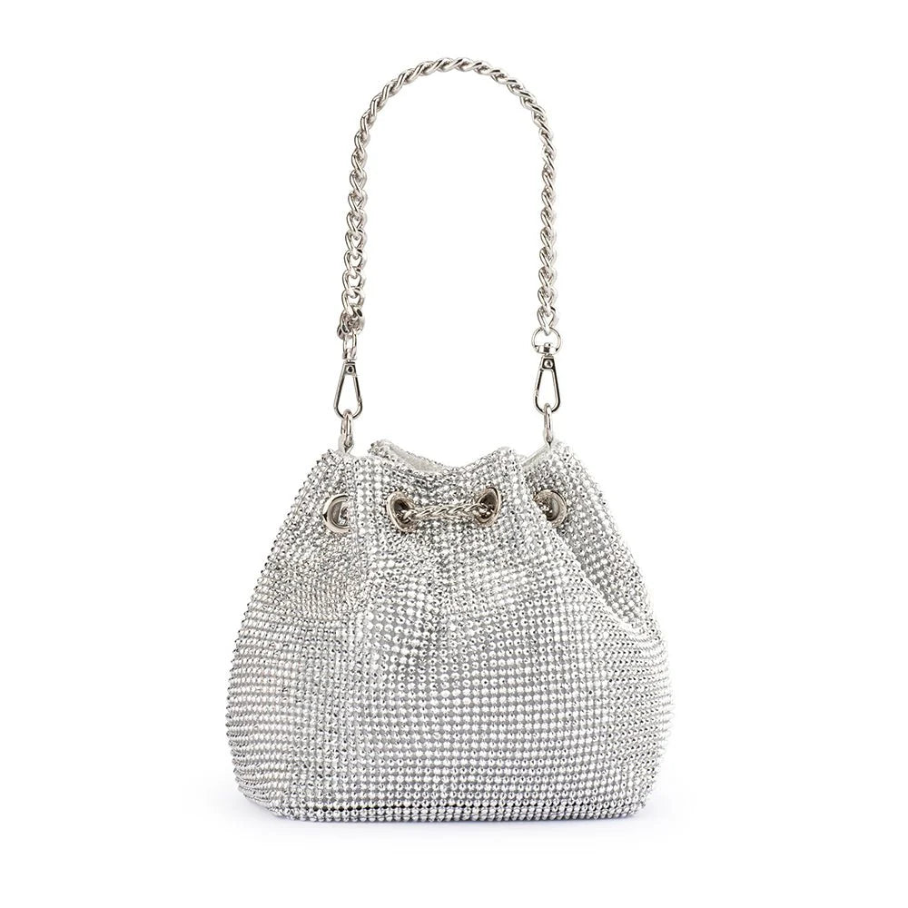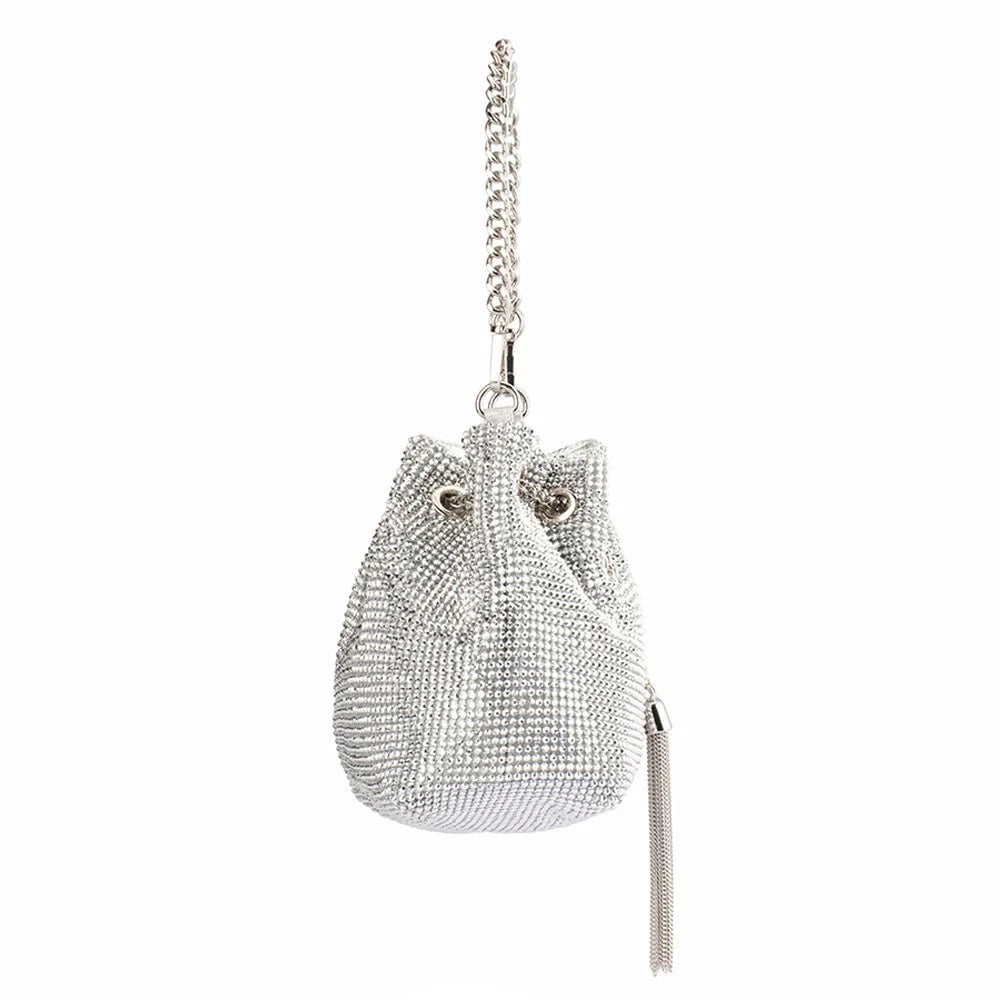 Add some glamour to your look with the MIRANDA Drawstring Top Handle Bag. An elegant piece featuring a stunning slouchy crystal body and a tasseled drawstring closure. This bag is large enough to fit all of your event needs, including your large smart phone, glasses, cards, cash and makeup essentials.